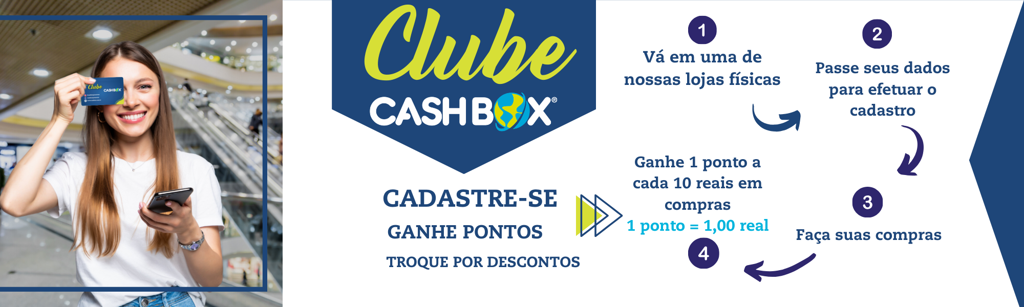 O Clube Cash Box tem como objetivo reconhecer, agradecer e presentear os clientes Cash Box, por meio da troca de pontos geradas por compras nas lojas físicas da sua rede e também com promoções exclusivas para sócios.